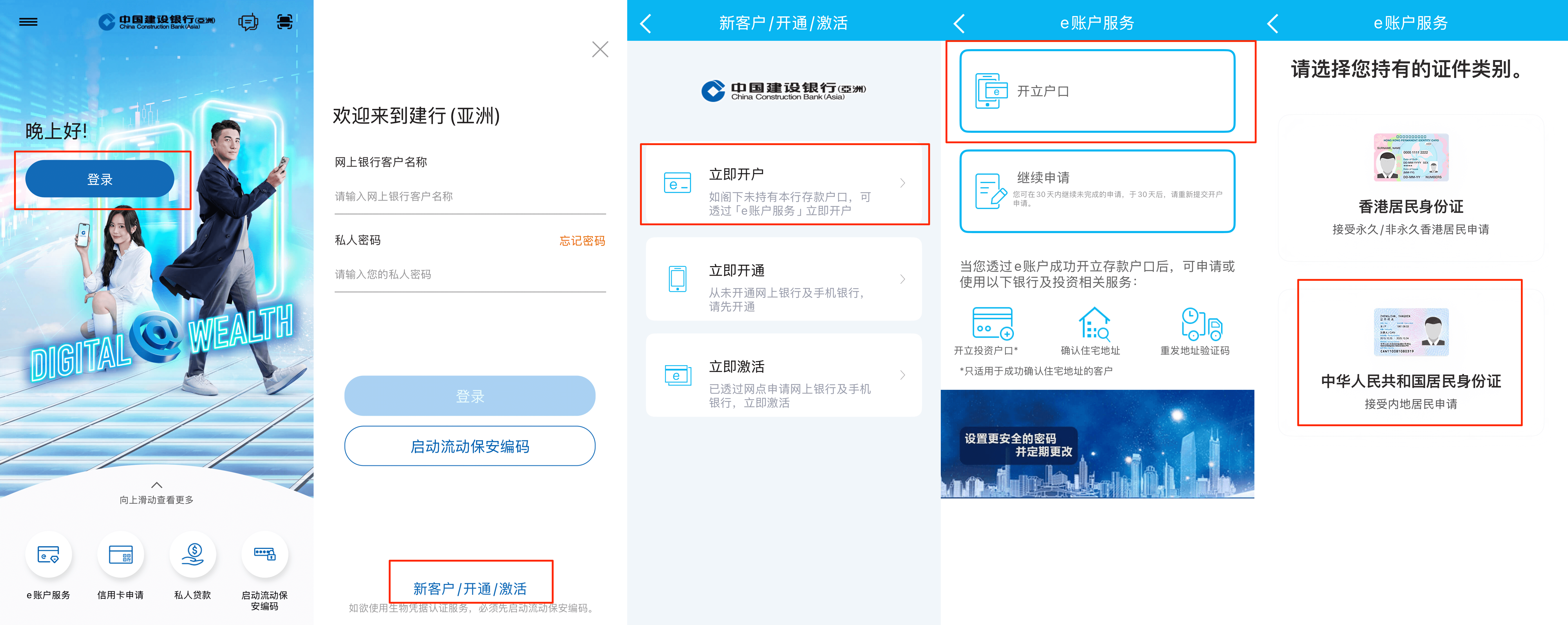 在App中选择 "登录" > "新客户/开通/激活" > "立即开户" > "开立户口" > "中华人民共和国居民身份证", 按照App指引完成后续开户流程。