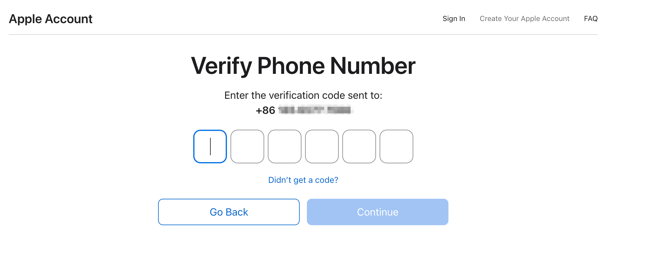 - 填写验证手机号,可以使用内地的 +86 手机号。