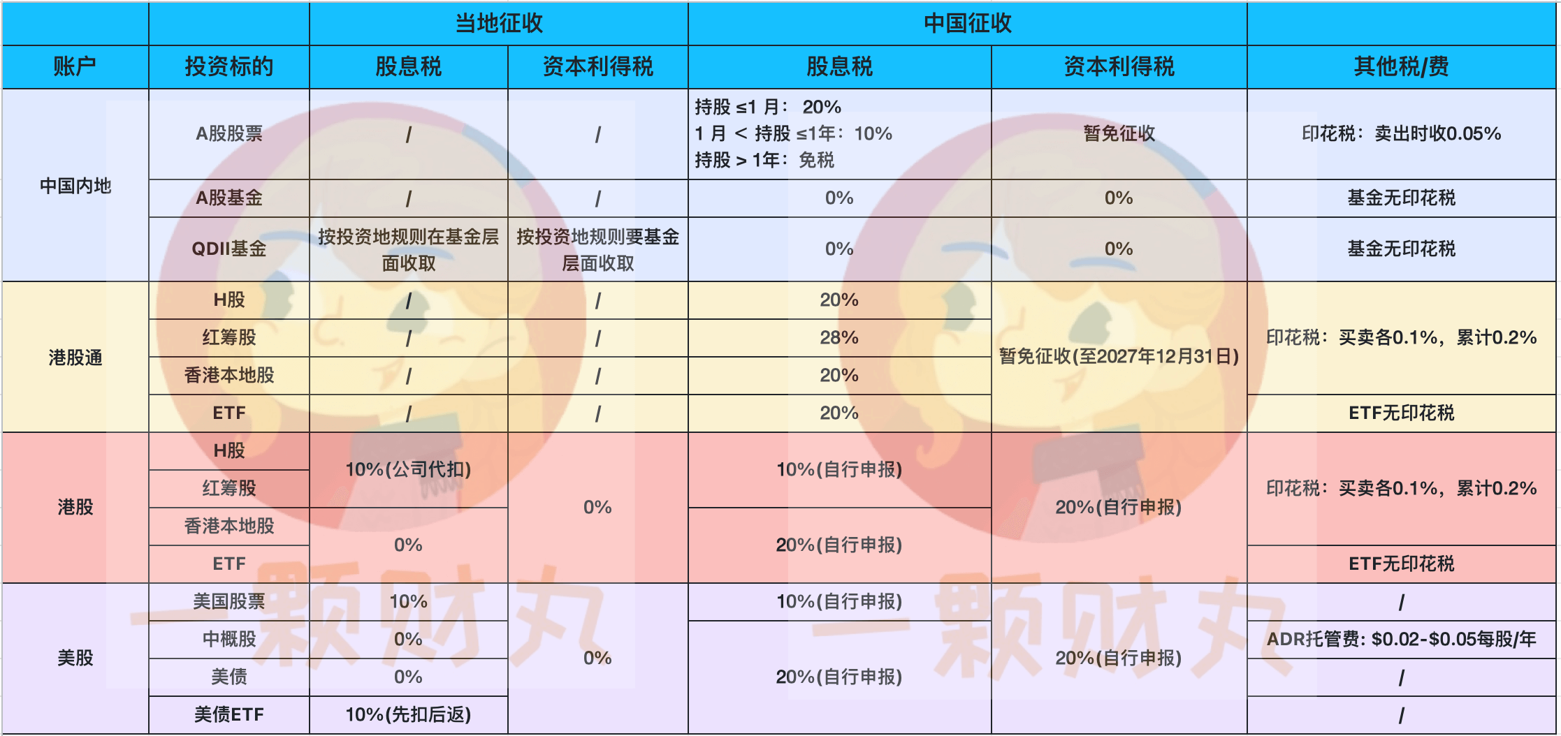 这里给大家列出了,中国税务身份,分别在A股、港股通、港股、美股投资的税率,大家可以根据自己的情况选择合适的投资方式,进行税务优化。