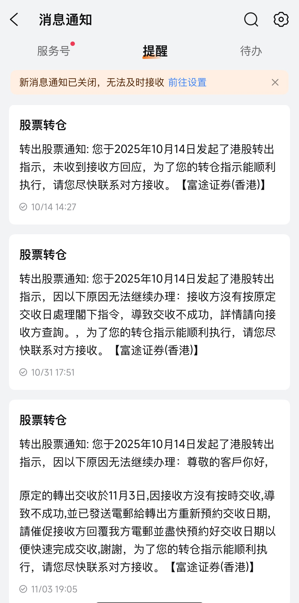 在整个过程中富途的体验是很好的,提交转仓申请没多久没给发了通知,说"未接到对方回应",但我以为是正常流程,就没有去催盈透接收。