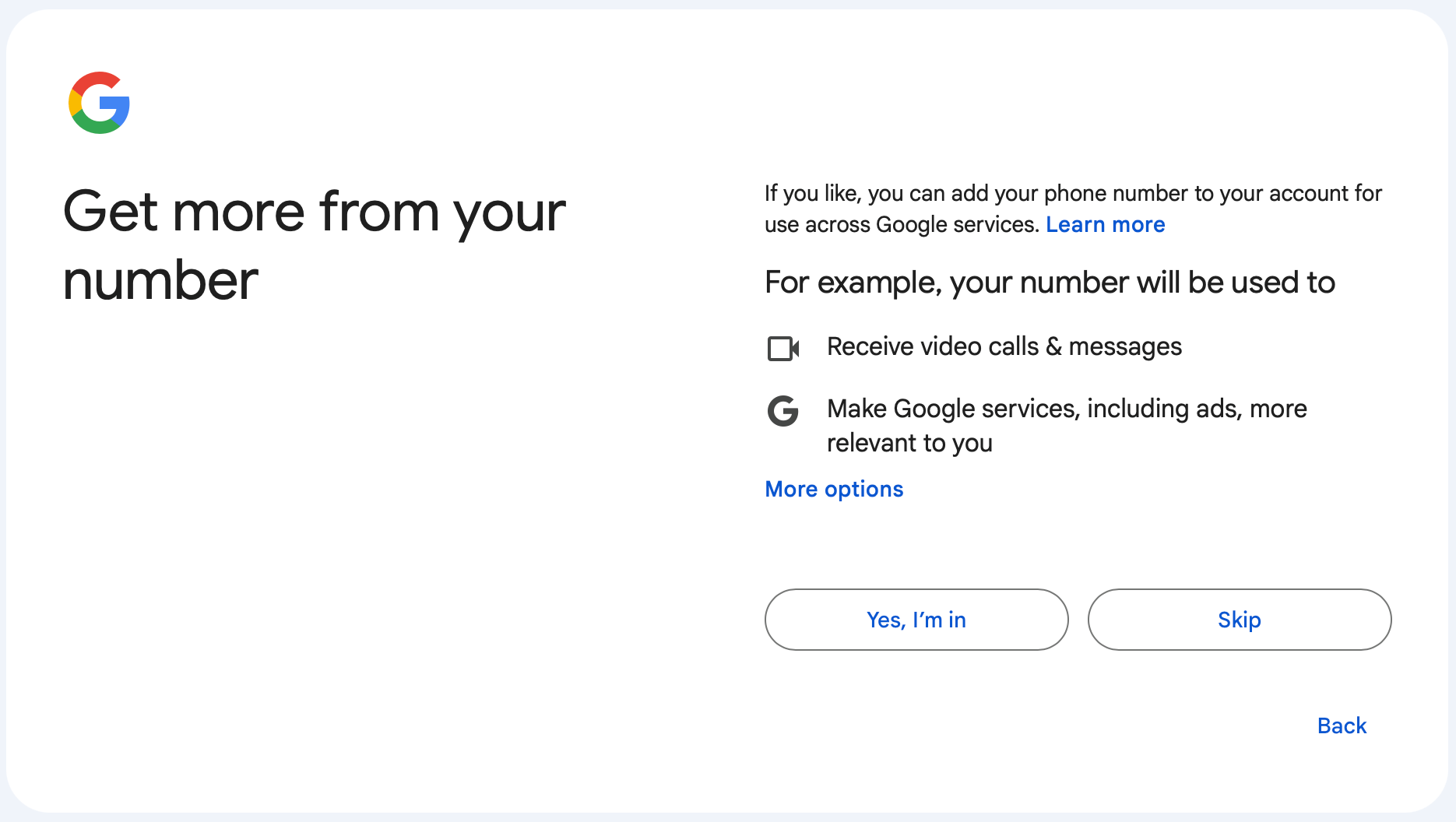 是否允许Google在其他Google服务使用你的手机号,"Yes" 或者 "Skip"都可以。
