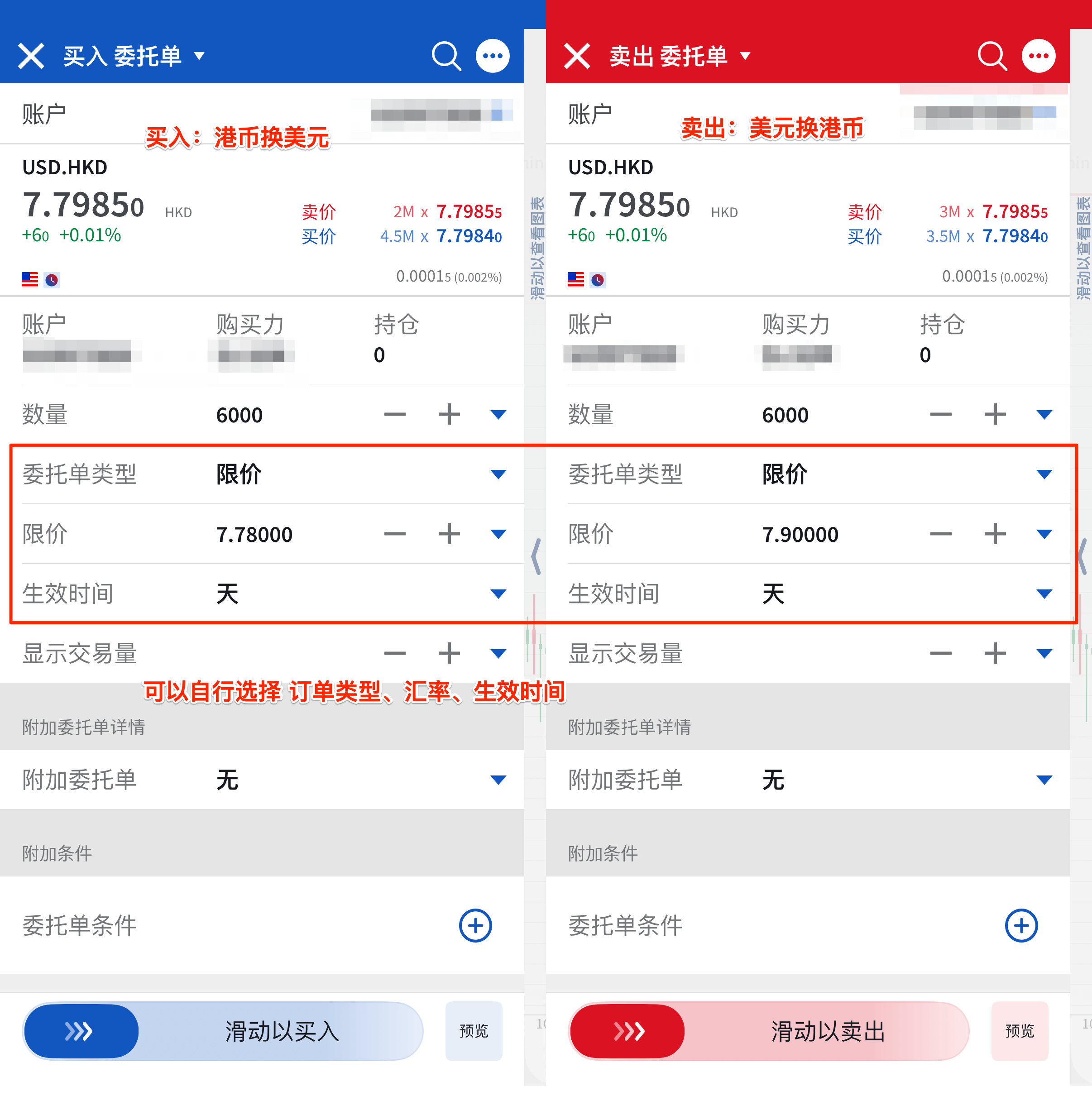 比如像上面的步骤,找到「USD.HKD」货币对页面,下面有「买入」、「卖出」两个按钮。