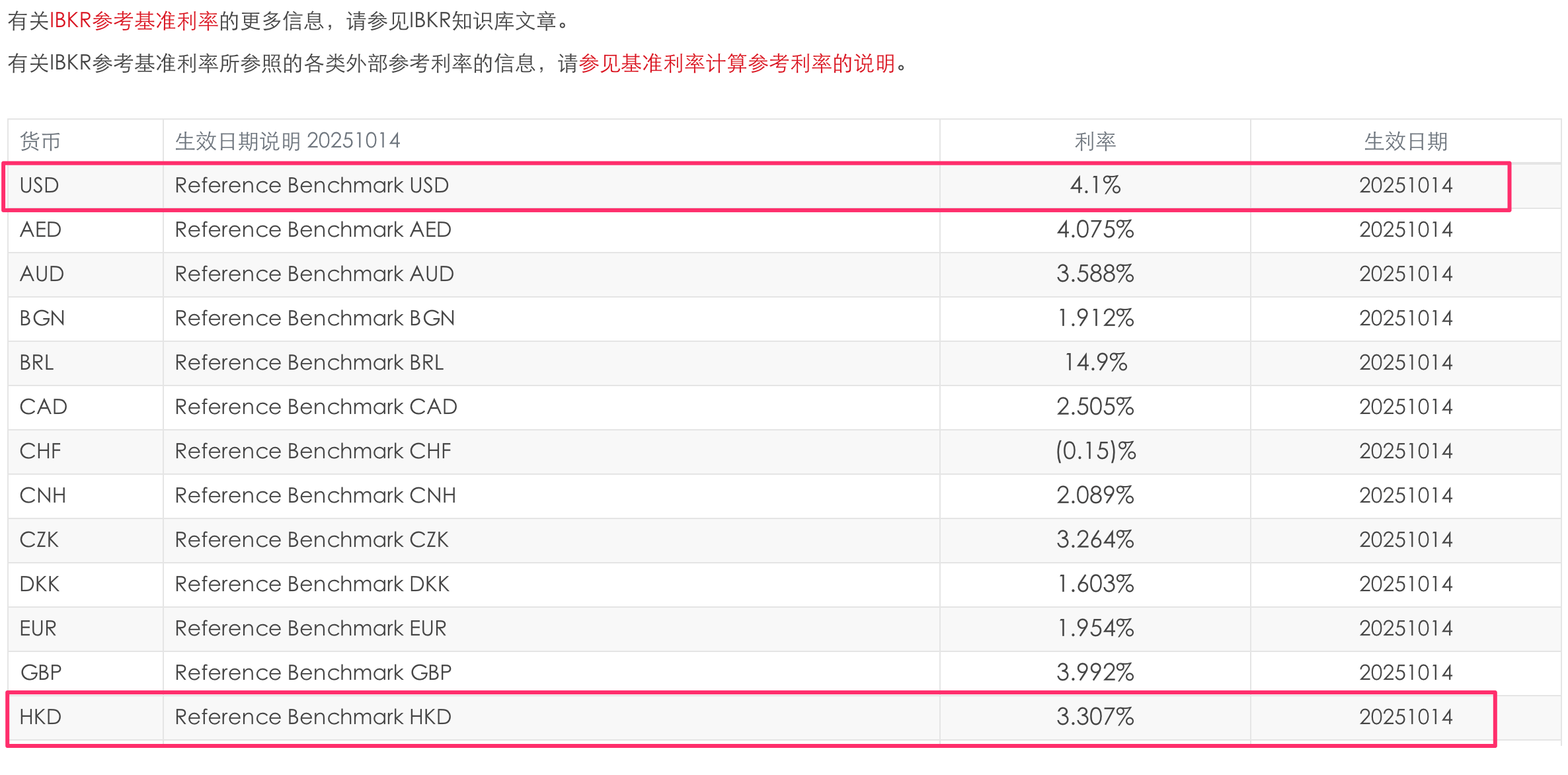 这里看一下,盈透显示的,2025年10月14日的基准利率,美元是4.1%,港元是3.307%。