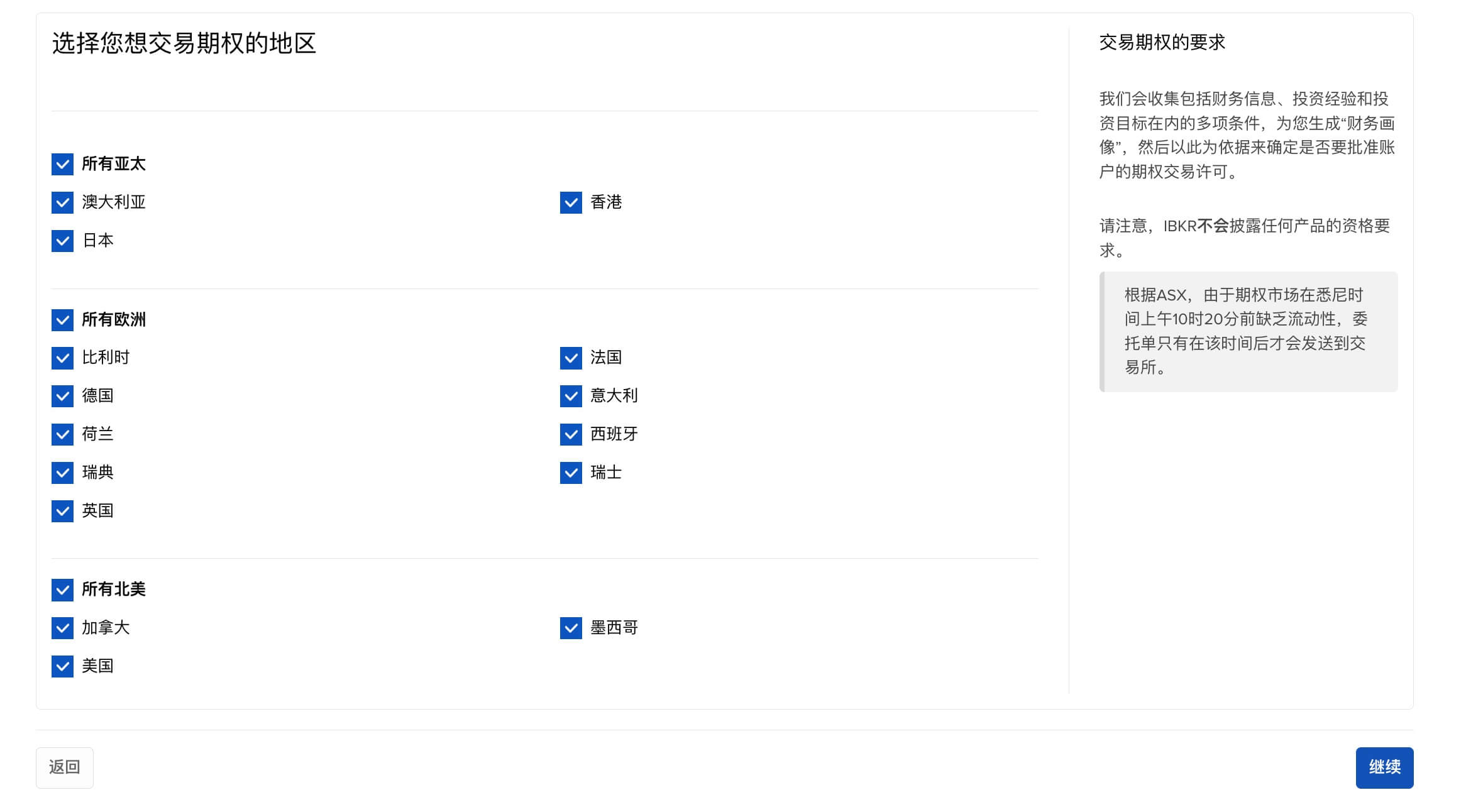 在里面,要选择「交易期权的地区」,和 「期权等级」。