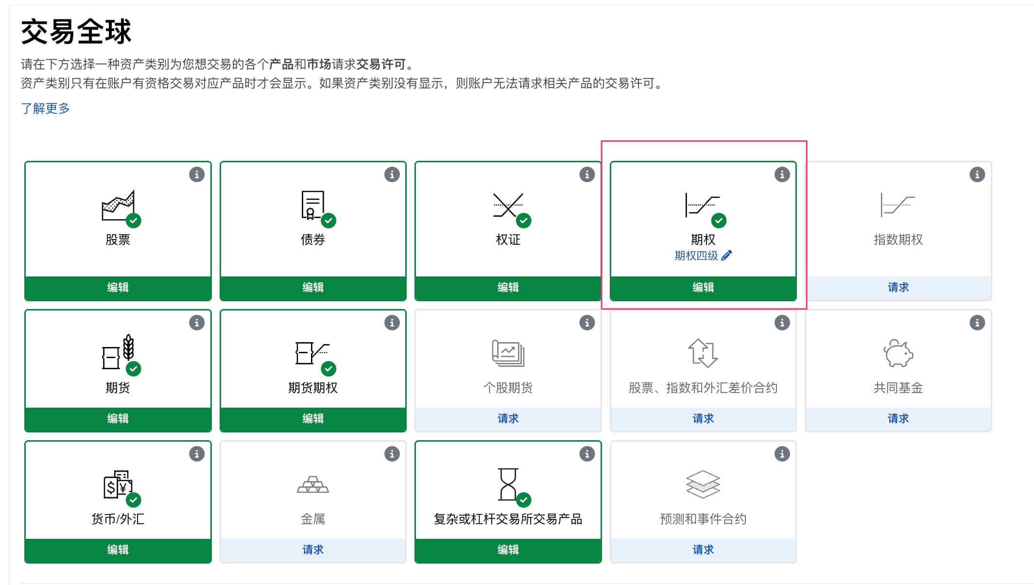 在交易许可页面,点击「期权」这一项,可以进去编辑已有的权限,或者请求新的权限。