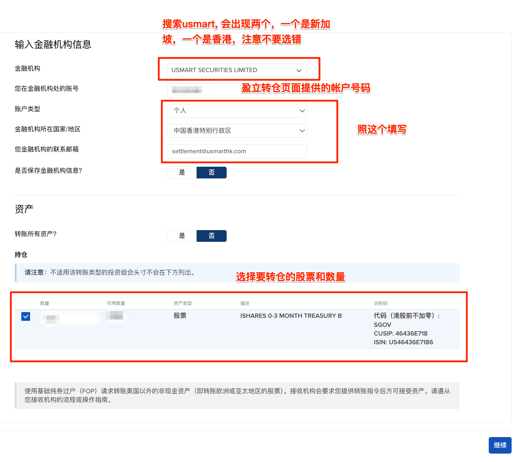 - 金融机构:选择 "USMART SECURITIES LIMITED",这个是盈立香港,还有一个新加坡的,不要选错了。