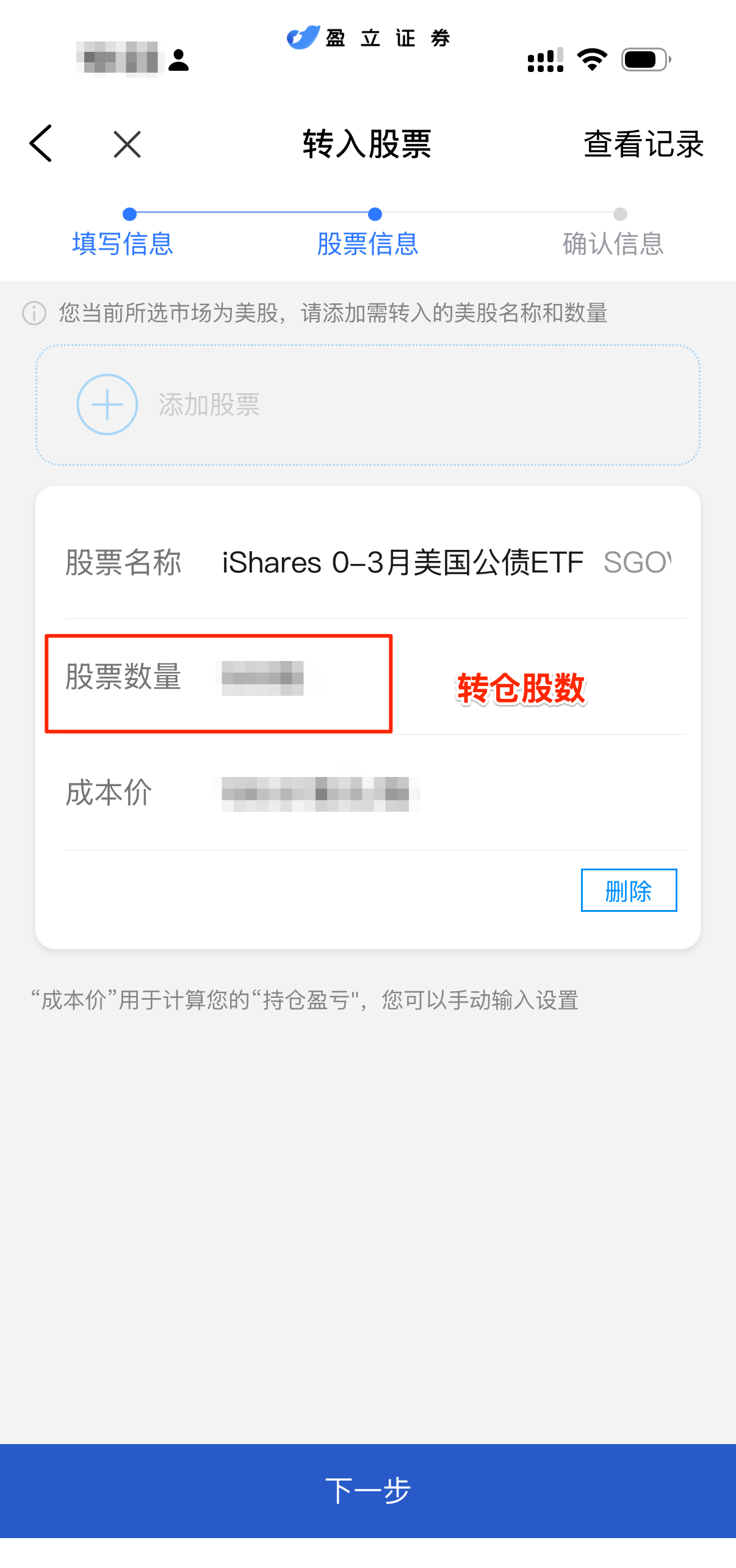 - 持仓:选择要转出的股票和数量,我这里只转一部分SGOV出去。