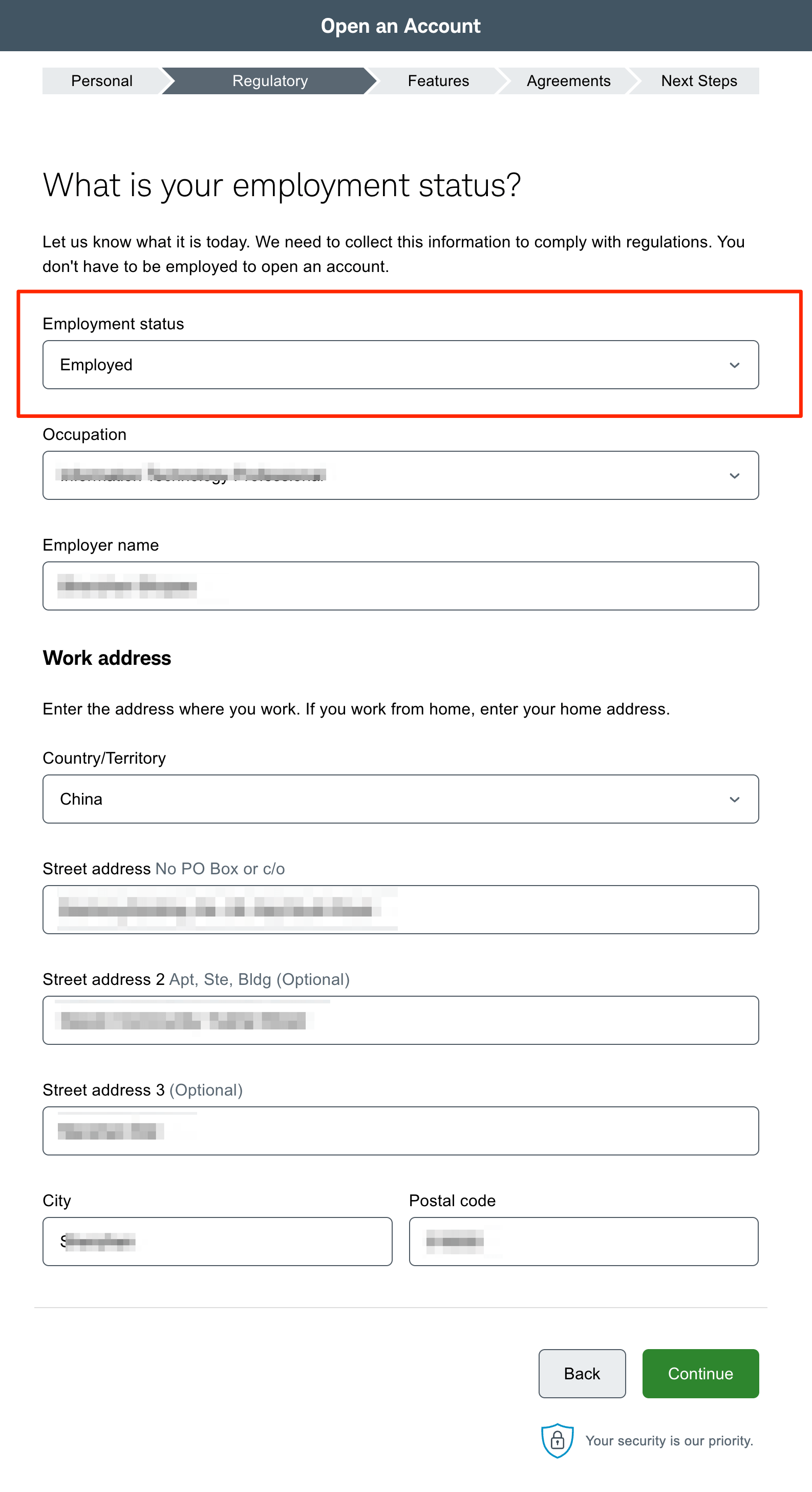 正常工薪族,就选「Employed」,然后下面根据实际情况填写自己的职业信息和公司地址。