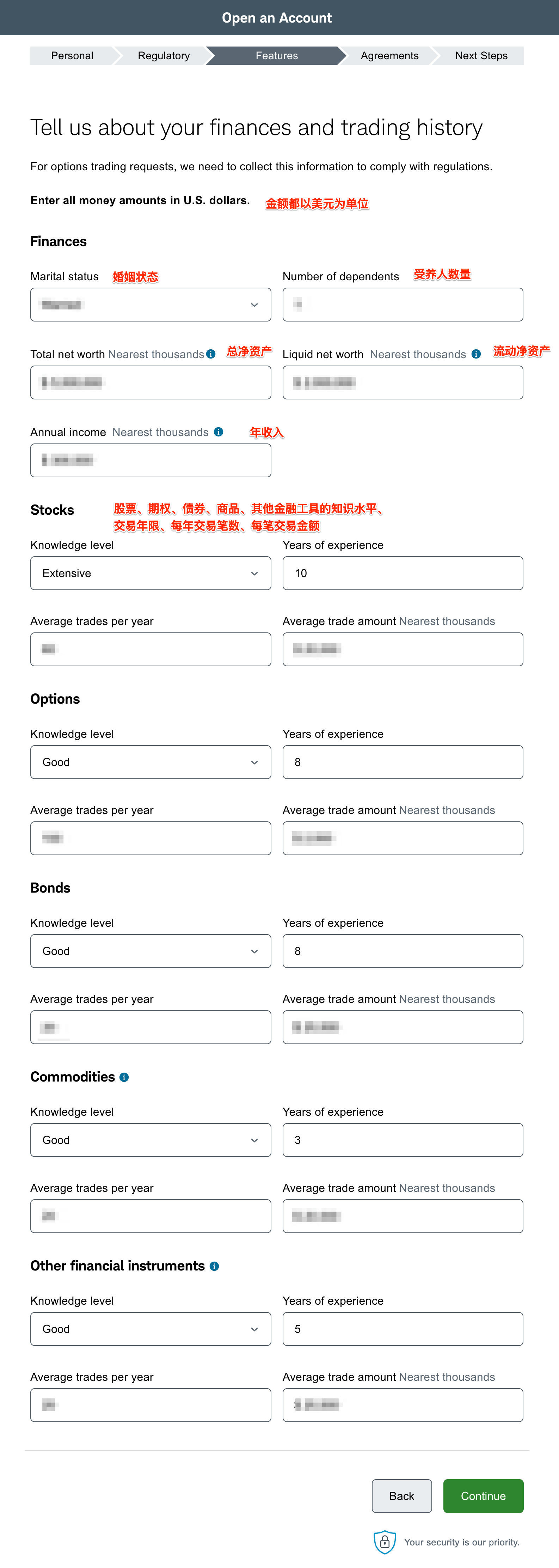 17、填写财务信息、金融资产的交易经验和交易频次。