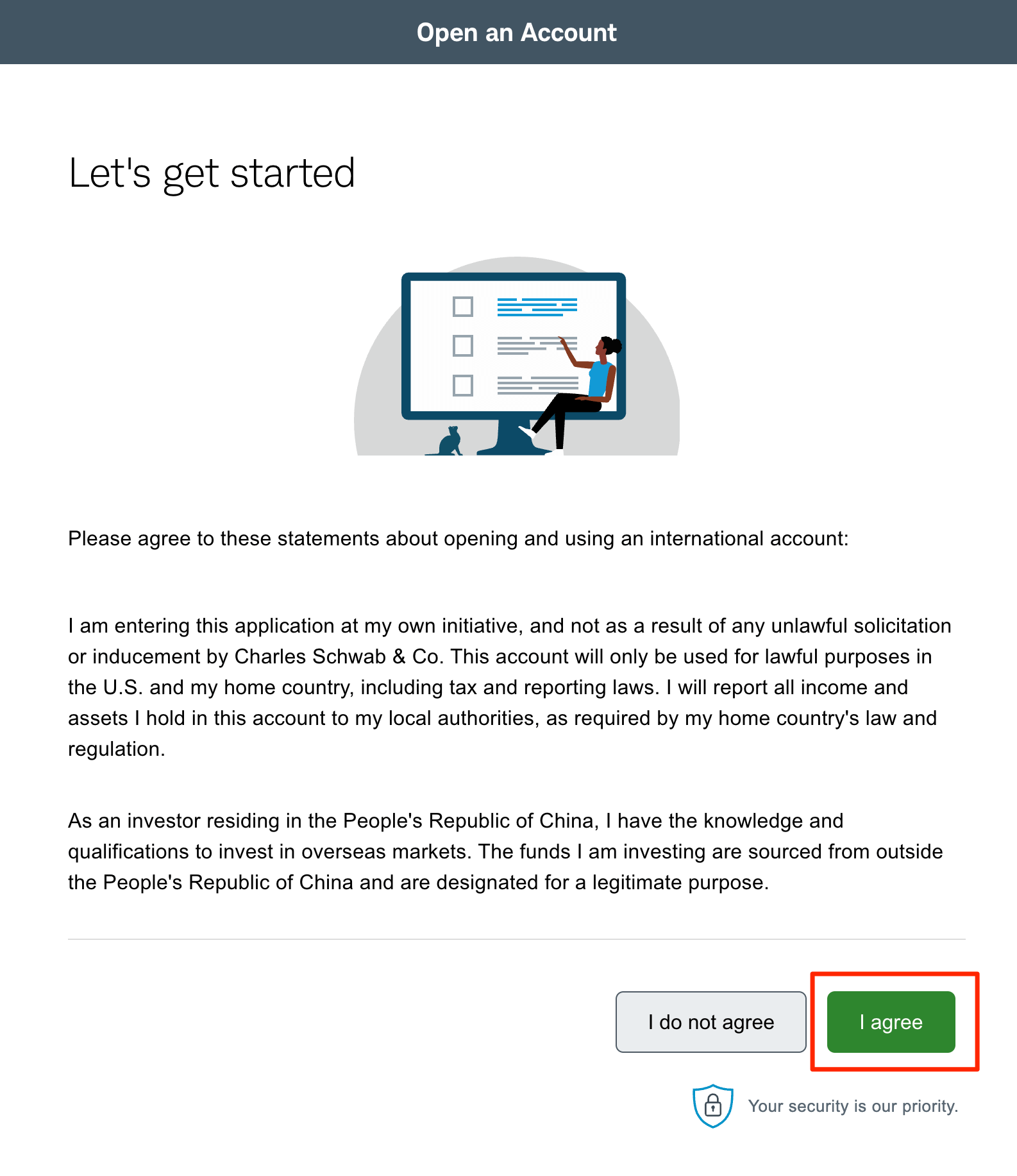 中国内地开户,需要确保左上角显示的是「Charles Schwab International(嘉信国际)」。