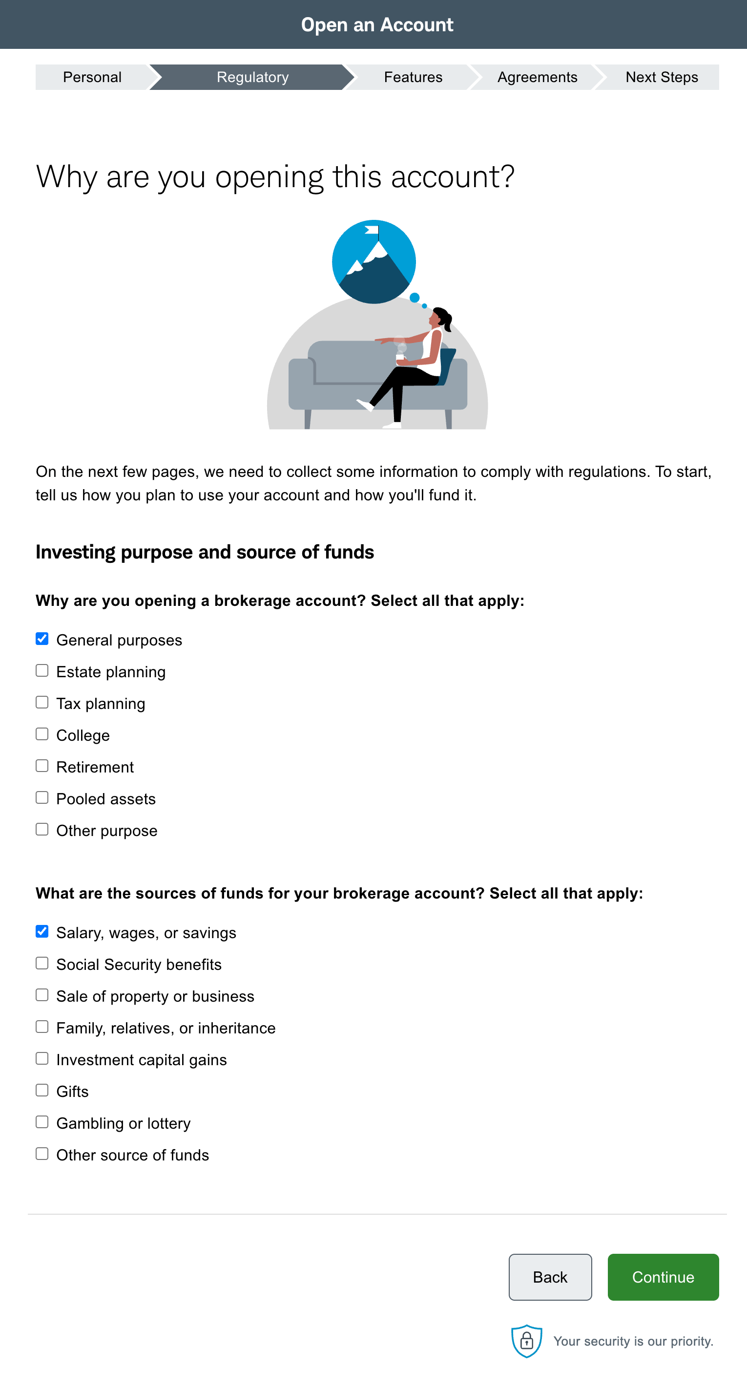 12、选择 「Investing Purpose(投资目的)」和「Source of Funds(资金来源)」。