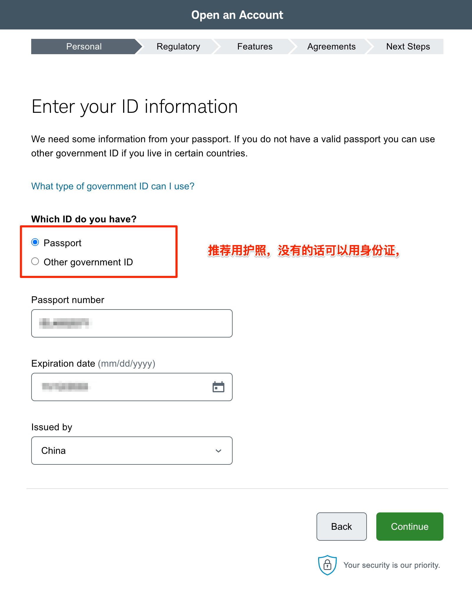 7、填写证件信息,建议用「护照」。