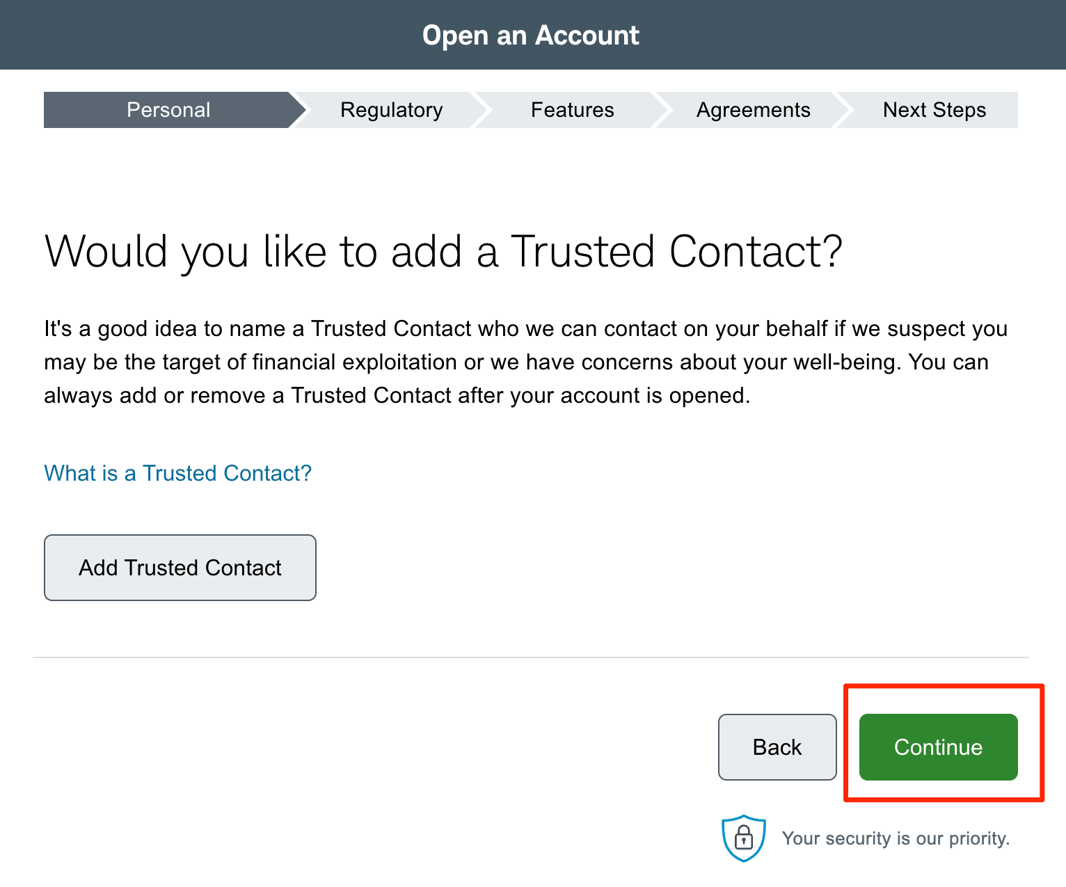 11、填写「Trusted Contact(信任的联系人)」,可以不填,直接「Continue」。