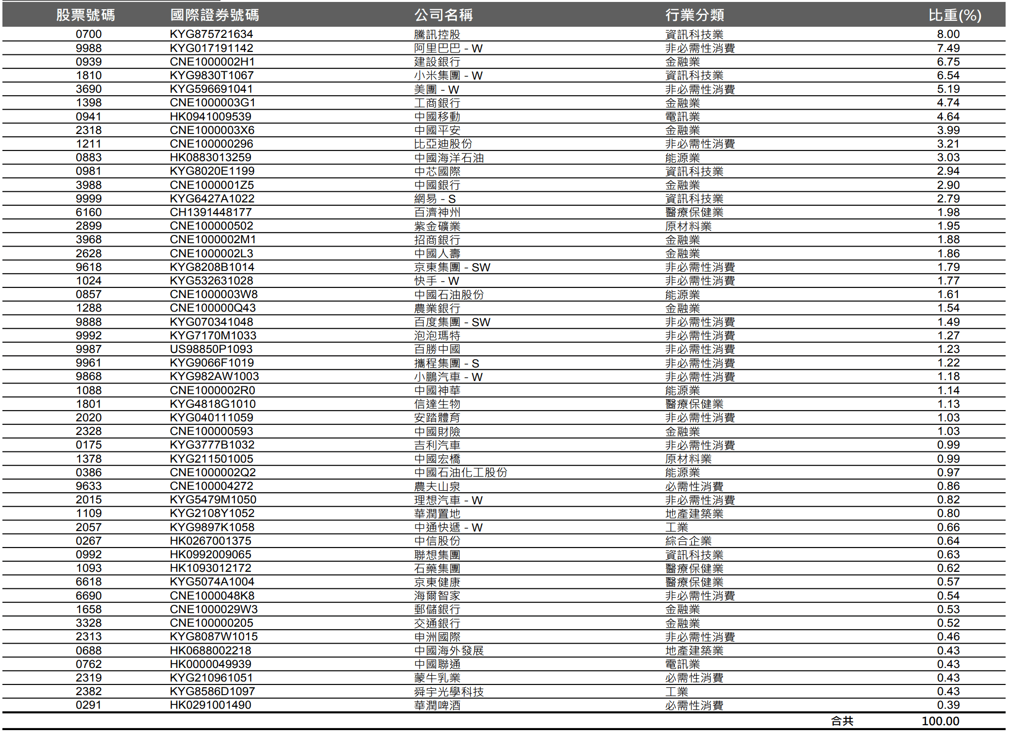 目前成分股固定为50只,选自市值最大、流动性最好的中国内地相关股票。