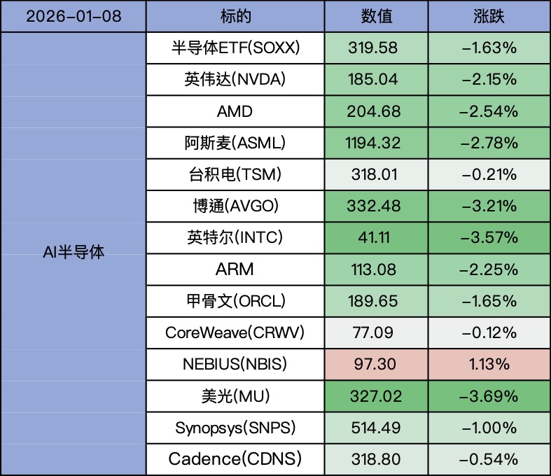 美国半导体整体回调,费城半导体指数跌1.83%, 半导体ETF(SMH)跌1.63%, 英伟达跌2.15%。