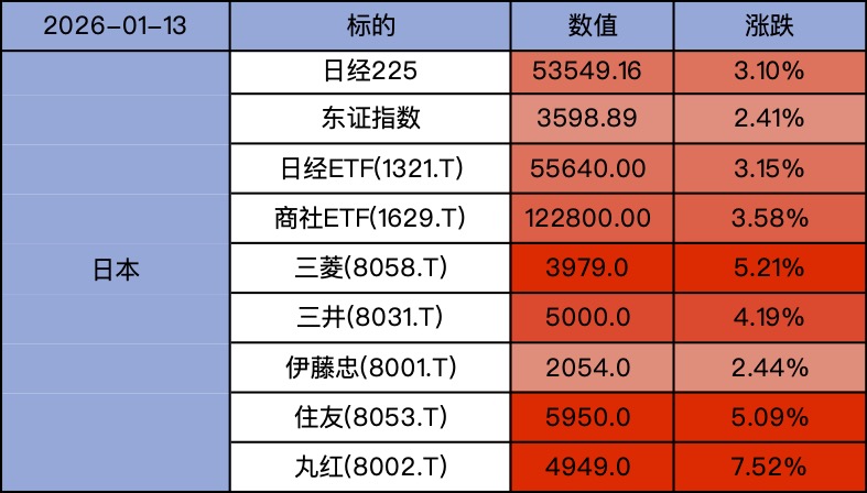 日经255上涨3.1%,东证指数上涨2.41%,商社ETF(1629)上涨3.58%。