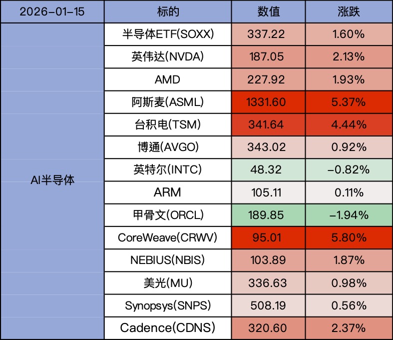 台积电上涨4.44%,阿斯麦上涨5.37%,费城半导体指数上涨1.76%, 半导体ETF(SMH)上涨2.08%。