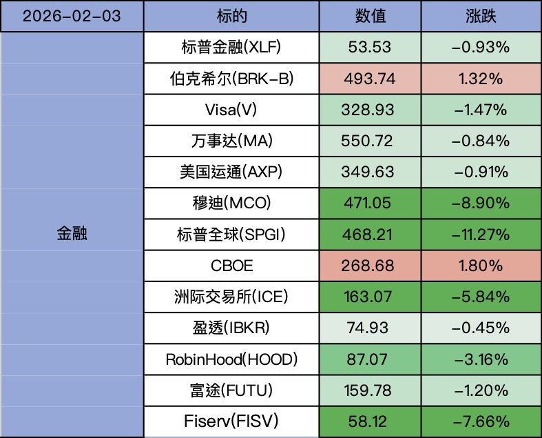 穆迪(MCO)下跌8.9%。 标普全球(SPGI)下跌11.27%。 洲际交易所(ICE)下跌5.84%。 费哲金融(FISV)下跌7.66%。 纳斯达克(NDAQ)下跌9.40%。 MSCI(MSCI)下跌6.93%。 FICO下跌8.47%。 益百利(EXPGY)下跌6.53%。 艾克菲(EFX)下跌12.11%。 TransUnion(TRU)下跌12.47%。