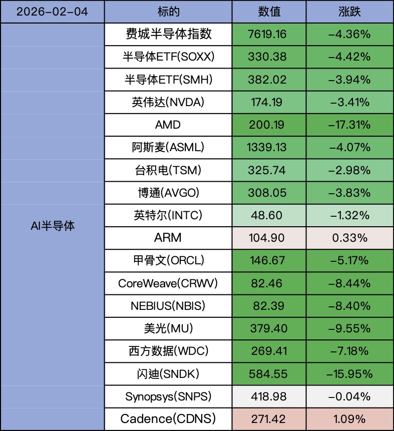 3、费城半导体指数下跌4.26%,半导体ETF SMH下跌3.94%。