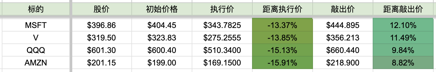 挂钩了4个标的,按当前股价相比初始价格算,QQQ、亚马逊涨,微软、Visa跌。