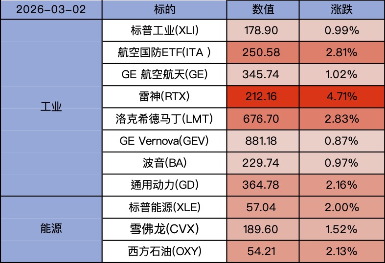 雷神(RTX)上涨4.71%,洛克希德马丁(LMT)上涨3.37%,诺斯罗普格鲁曼(NOC)上涨6.02%。