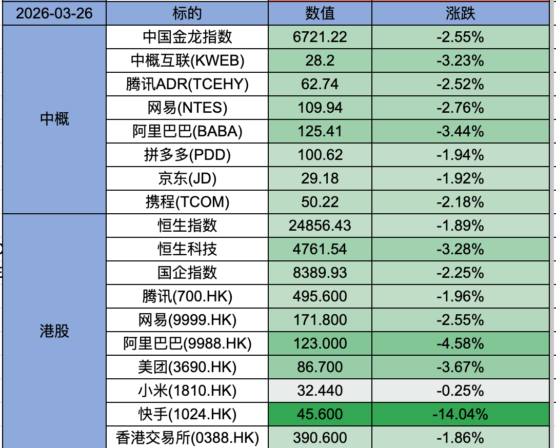 中国金龙指数下跌2.55%,中概股ETF(KWEB)下跌3.23%。腾讯、网易、阿里巴巴、拼多多都在下跌,昨天快手还下跌了14.04%。