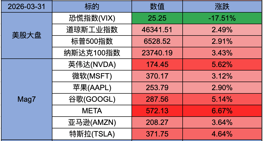受此影响,隔夜美股大反弹,道琼斯指数上涨2.49%, 标普500上涨2.91%,纳斯达克100上涨3.43%。