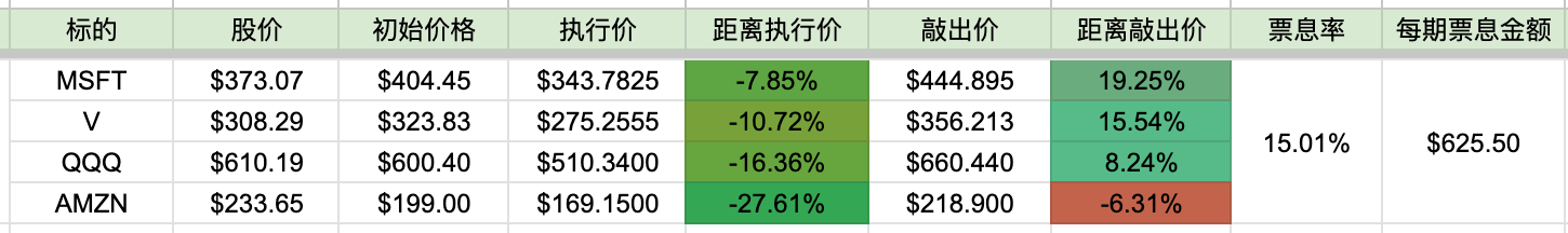 与购买时候比,微软、Visa是下跌的,QQQ微涨,亚马逊大涨17%,直接突破了敲出价,要接到亚马逊有点困难了。