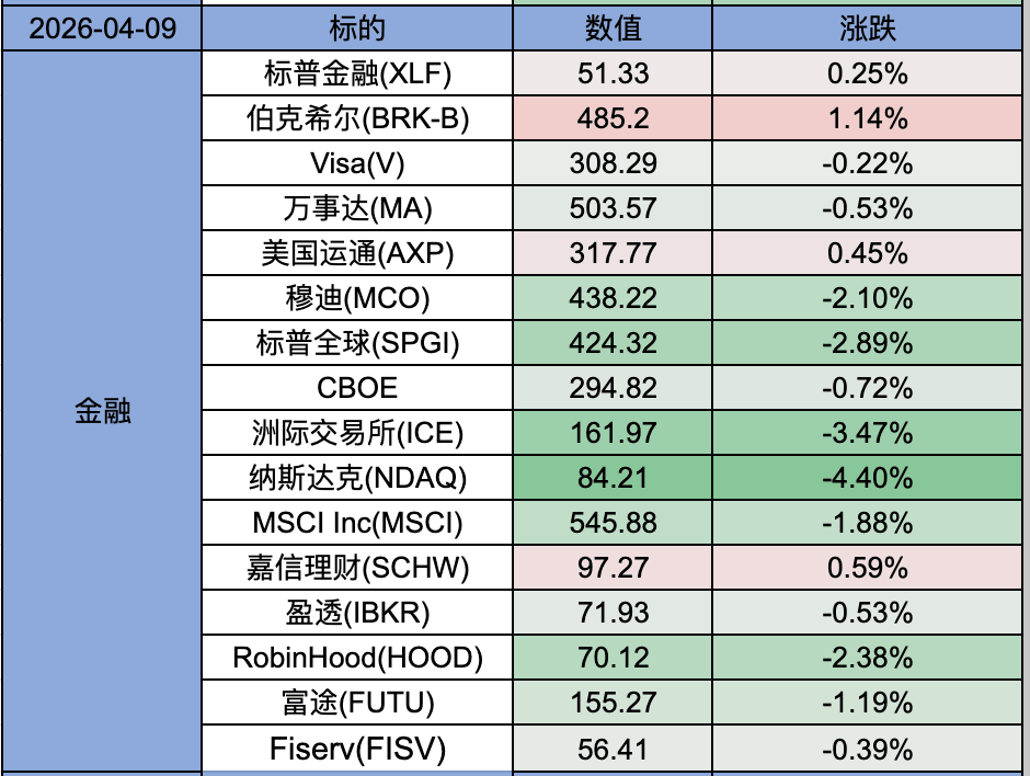 金融板块中,穆迪跌2.1%, 标普全球跌2.89%, 洲际交易所跌 3.47%, 纳斯达克跌4.4%。