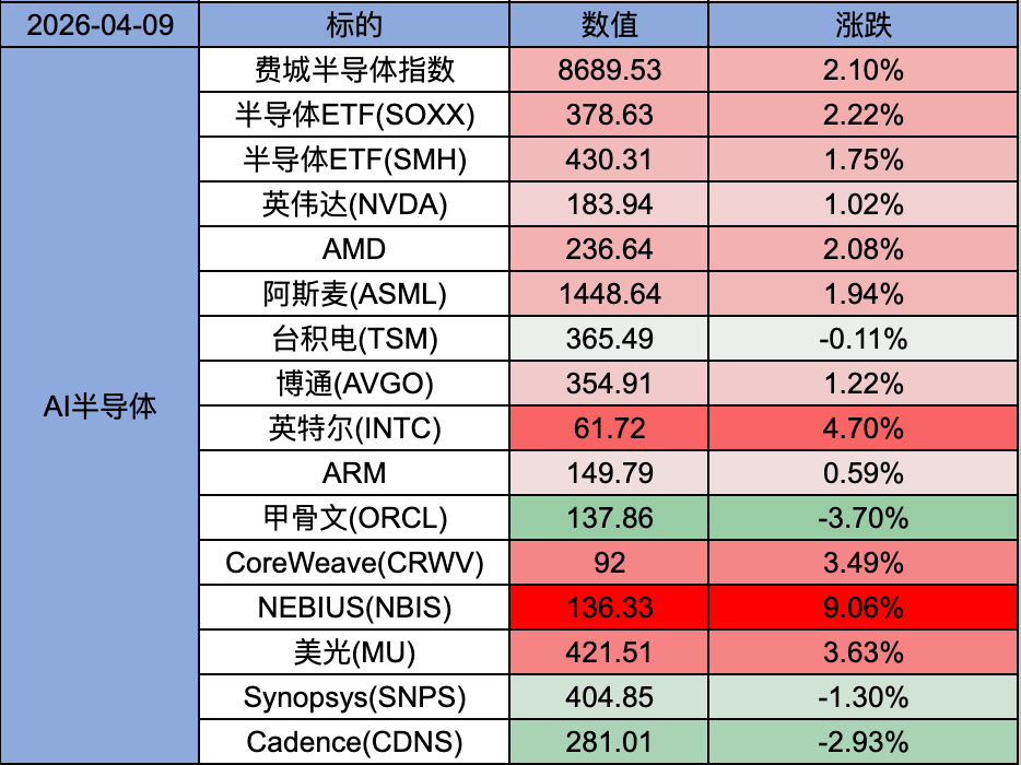 昨天Meta涨2.61%, CoreWeave涨3.49%, Nebius涨9.06%。