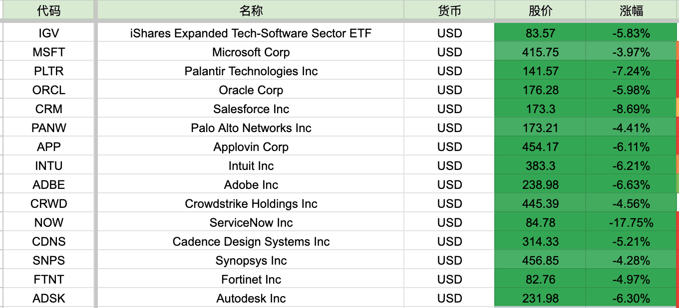 ServiceNow狂跌17.75%, 整个软件板块血流成河,软件ETF(IGV)下跌5.83%, 微软也下跌了3.97%。