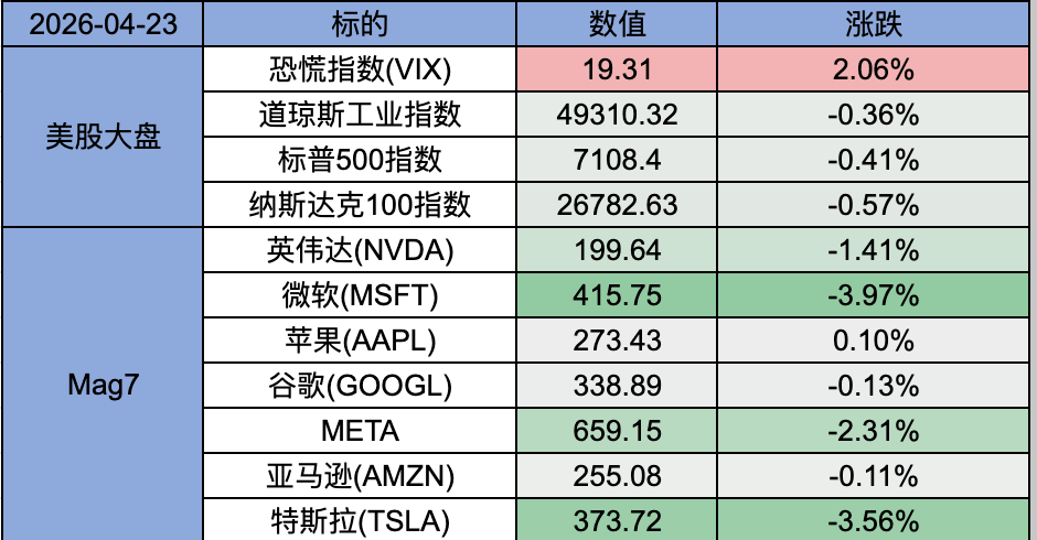 道琼斯指数跌0.36%, 标普500跌0.41%, 纳斯达克跌0.57%,恐慌指数上涨,到19.31。